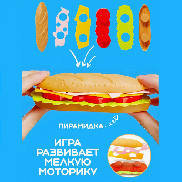 игрушка детская бургер. В наборе вы найдете пластиковые булочки, сыр, овощи, и другие ингредиенты, необходимые для создания вкусногобургера. Все продукты выполнены с большой детализацией и яркими цветами, что делает игру еще более реалистичной и захватывающей.